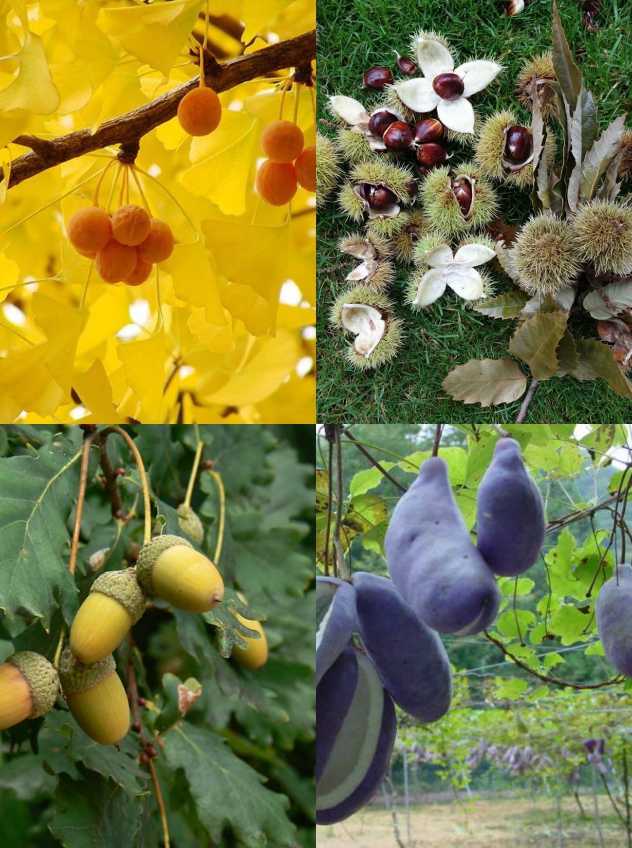 (画像:銀杏の実、栗、どんぐり、アケビ)
